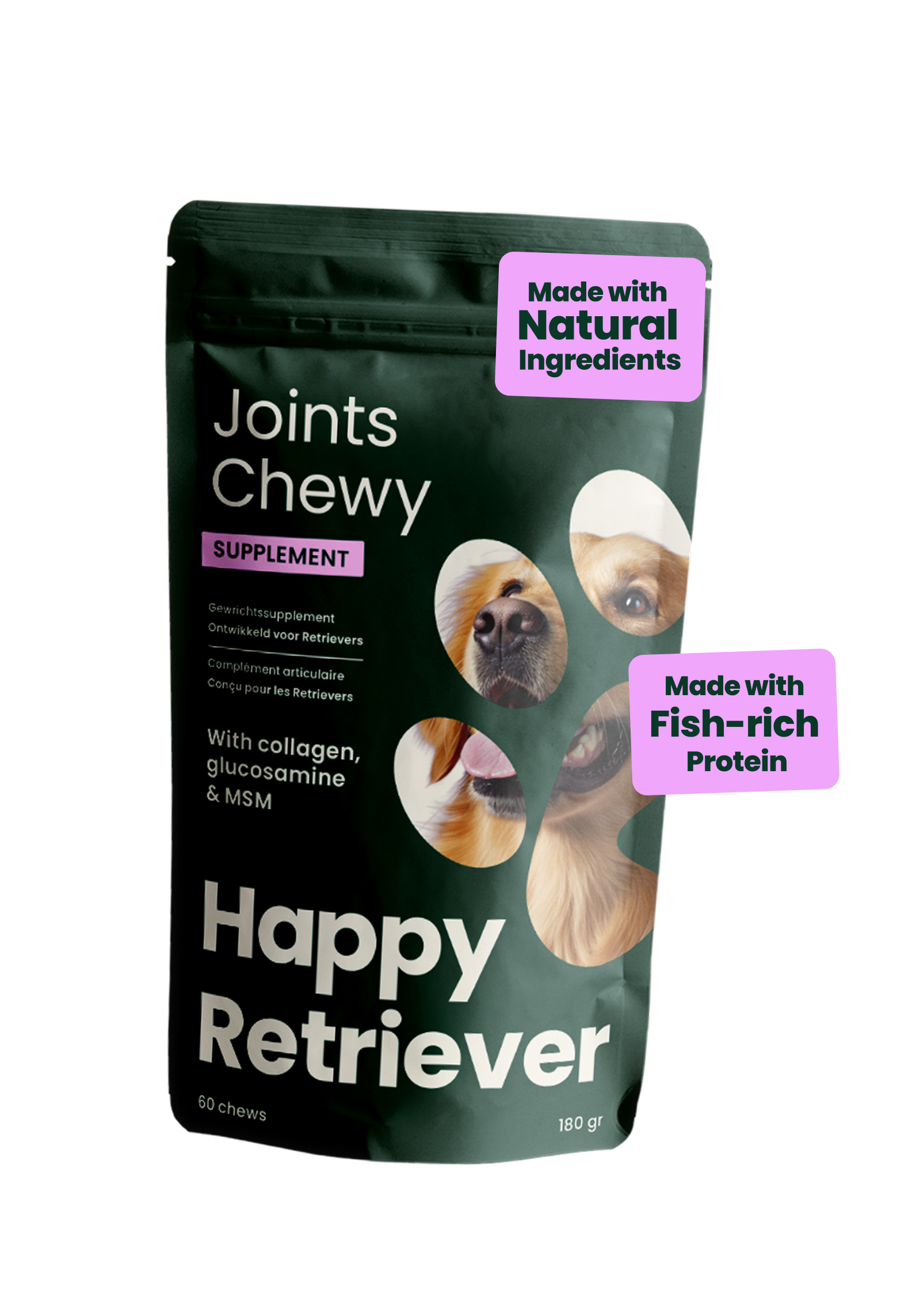 Nous ne croyons pas aux friandises génériques. Nos recettes d'aliments complémentaires sont développées pour cibler précisément les besoins les plus essentiels des Retrievers.